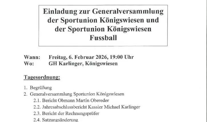 Am Freitag, den 6. Februar 2026 findet die Generalversammlung der Union und der Union Fussball statt. Alle Sportinteressierten und speziell alle Vereinsmitglieder sind dazu herzlich eingeladen: